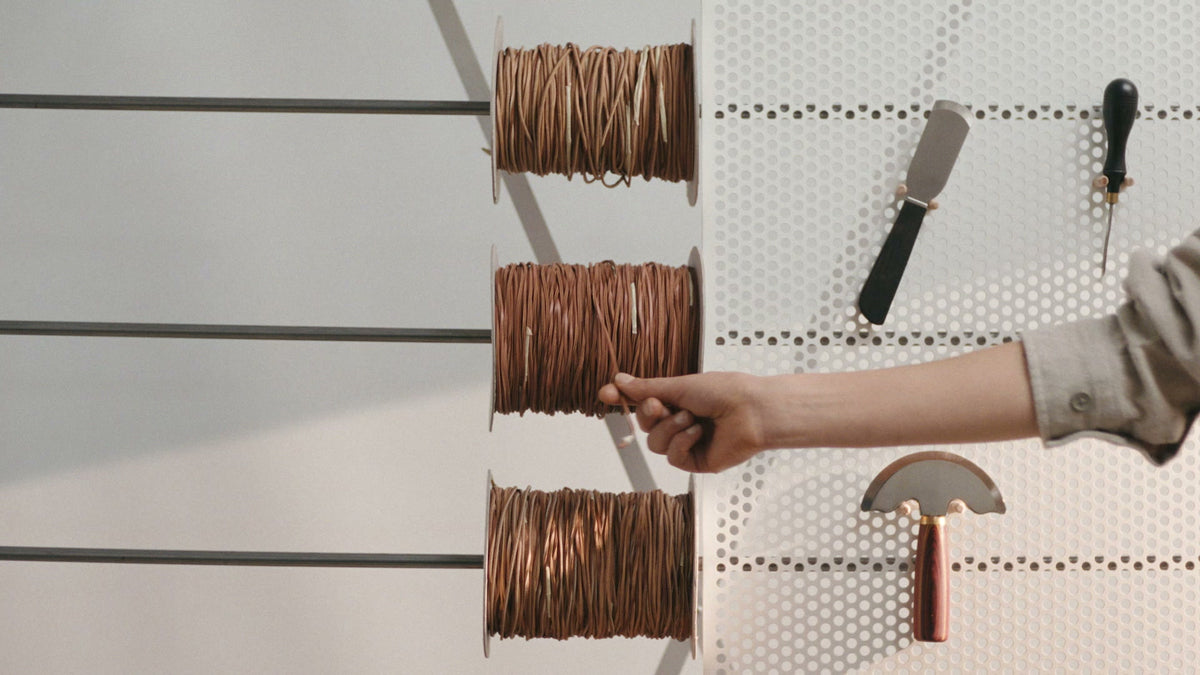 Its iconic silhouette is adorned with unique interlacing assembled by hand from leather offcuts, where each cord tells the story of the material.