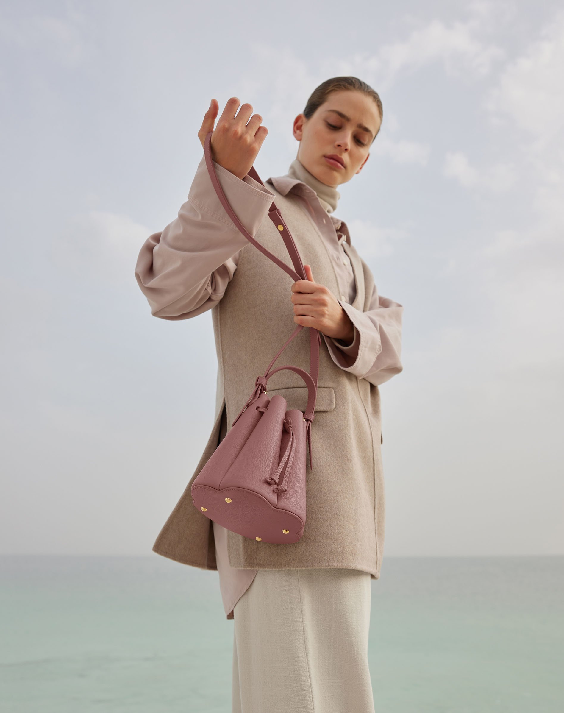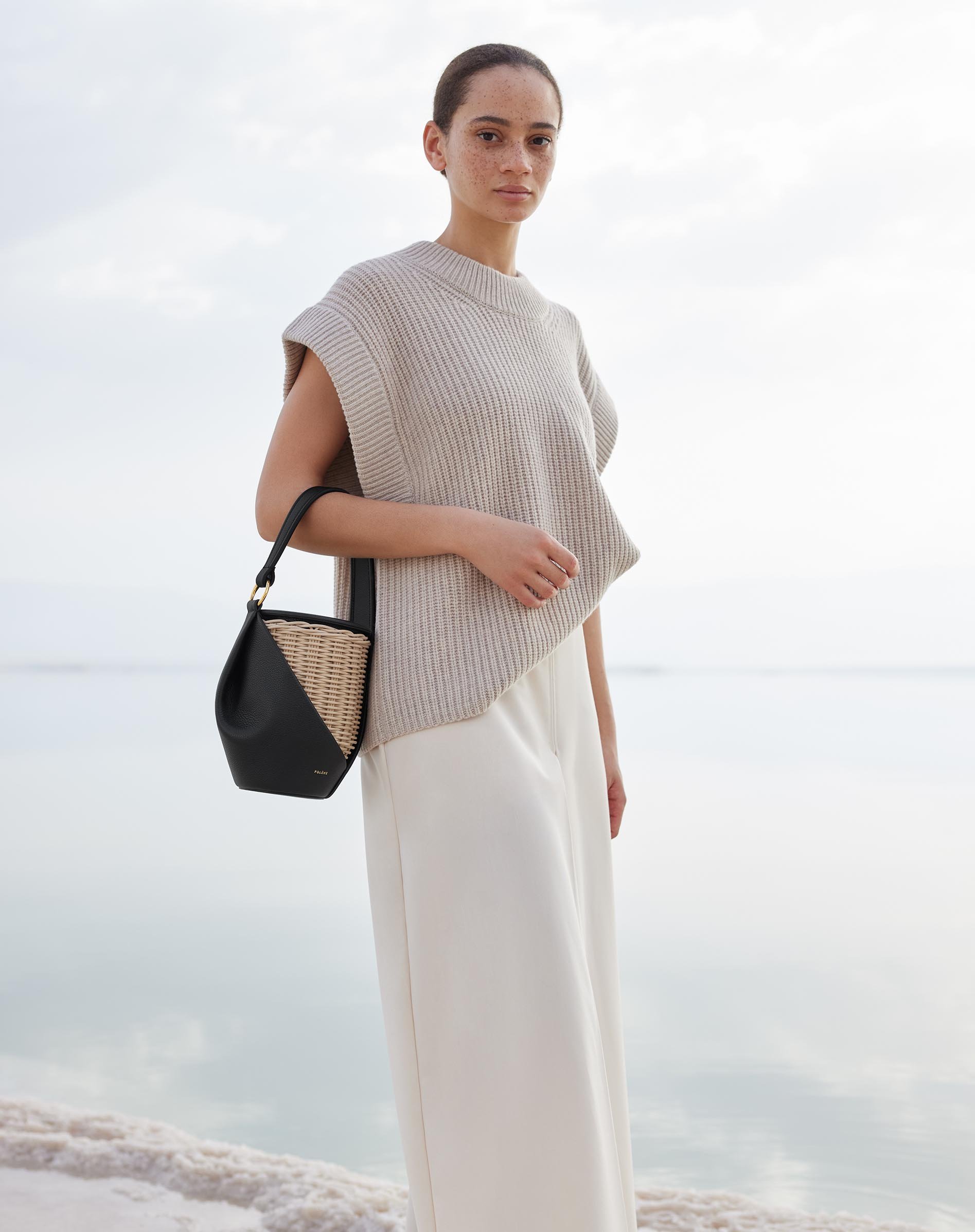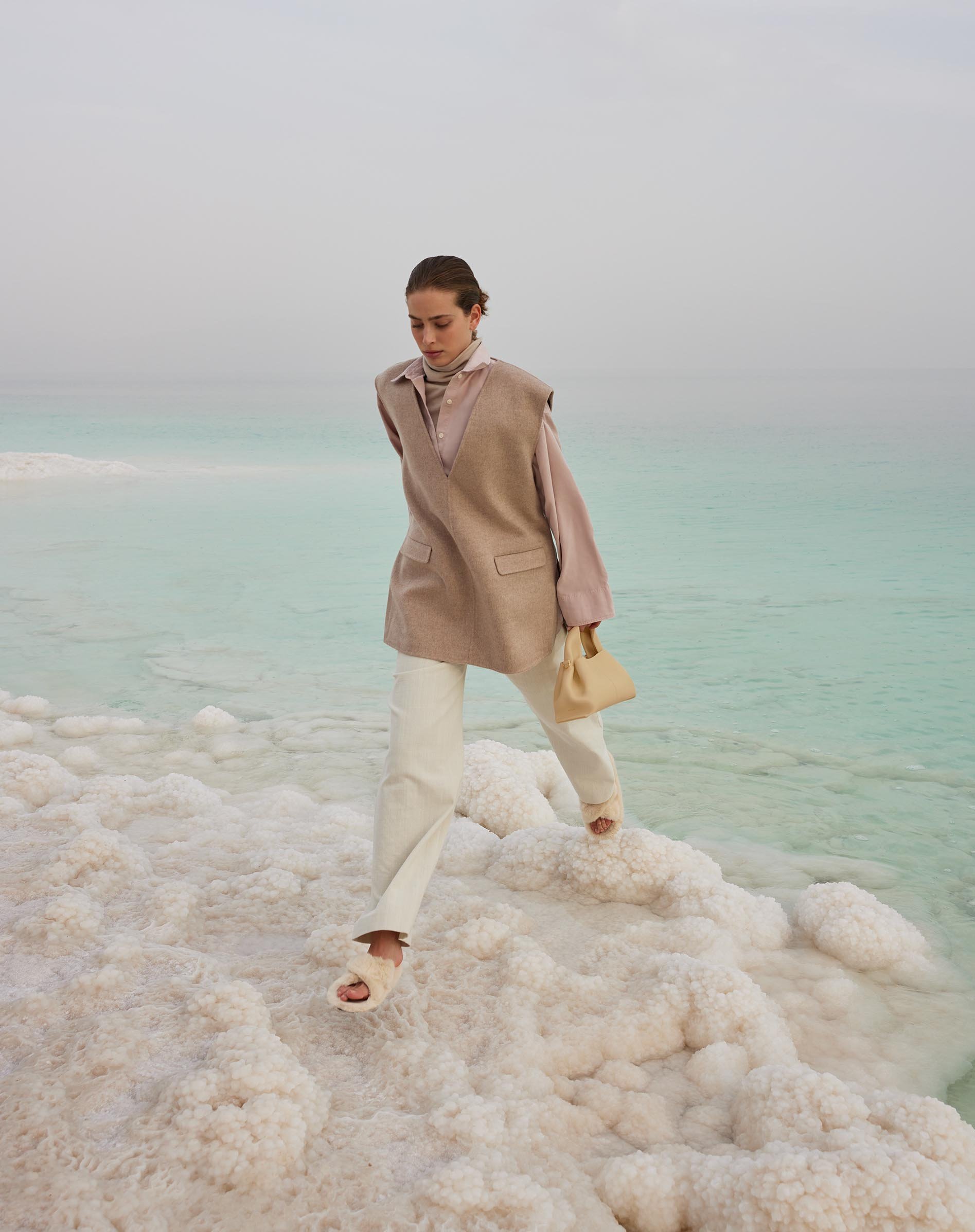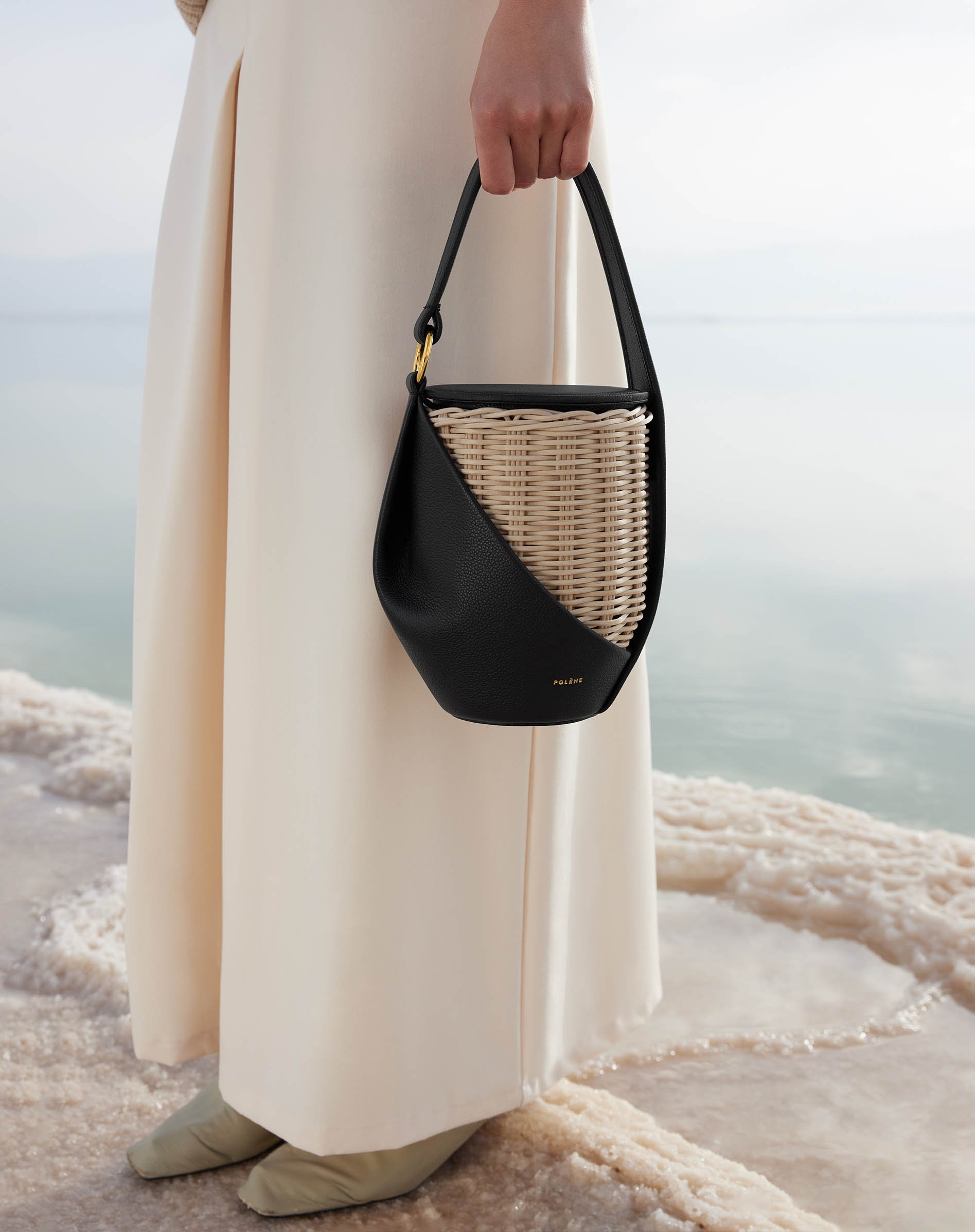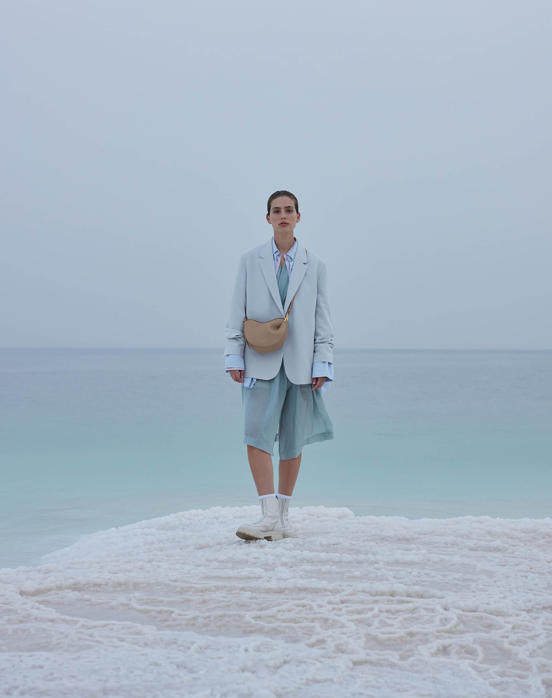 The minimalist landscapes of the salty sea. The Dead Sea is the perfect backdrop to showcase Polène’s leather goods collection. A location chosen for its duality—both minimalist and plural. Sleek, a superposition of plane lines, yet versatile when the sky’s colors are reflected in the water and changing salt beds.