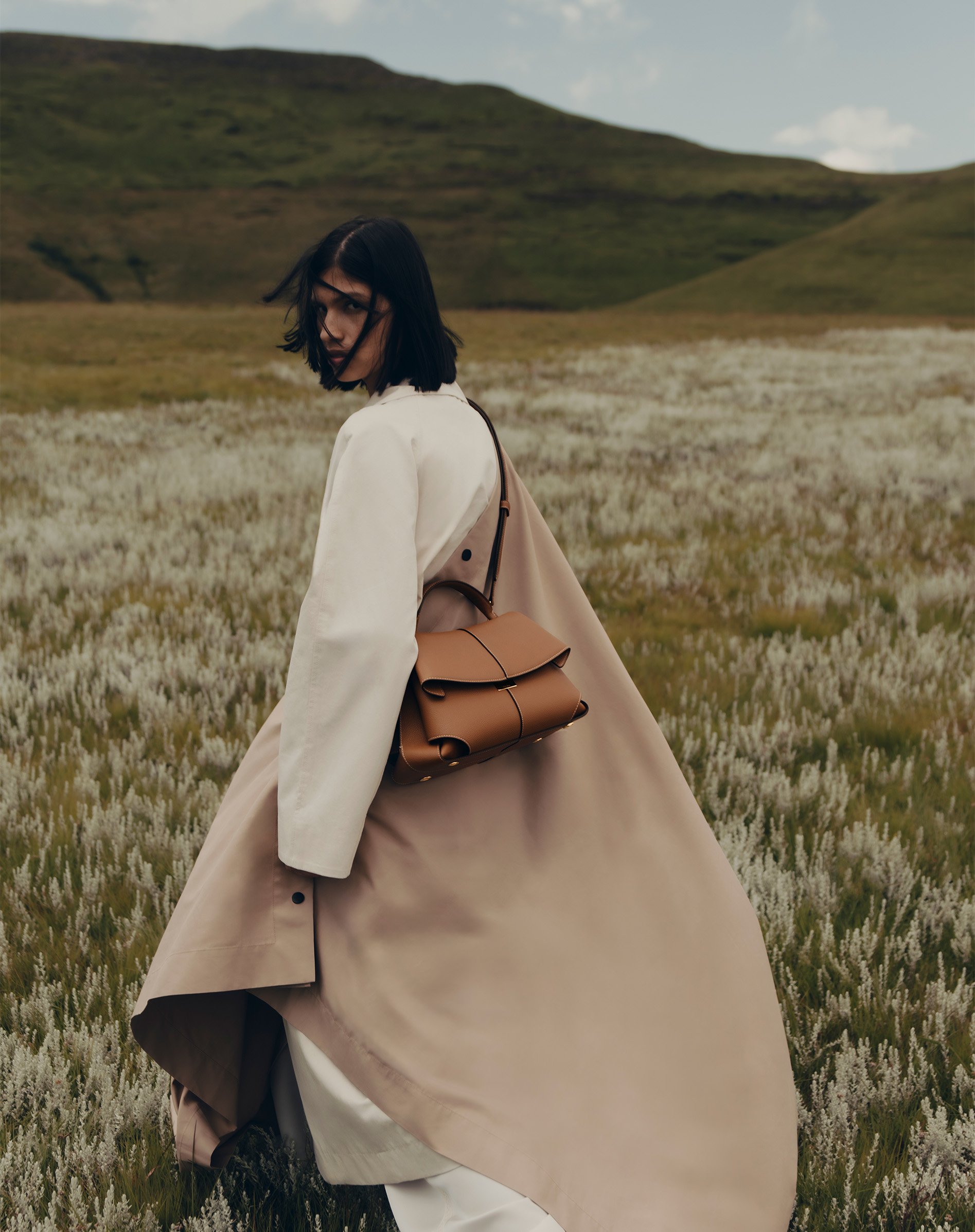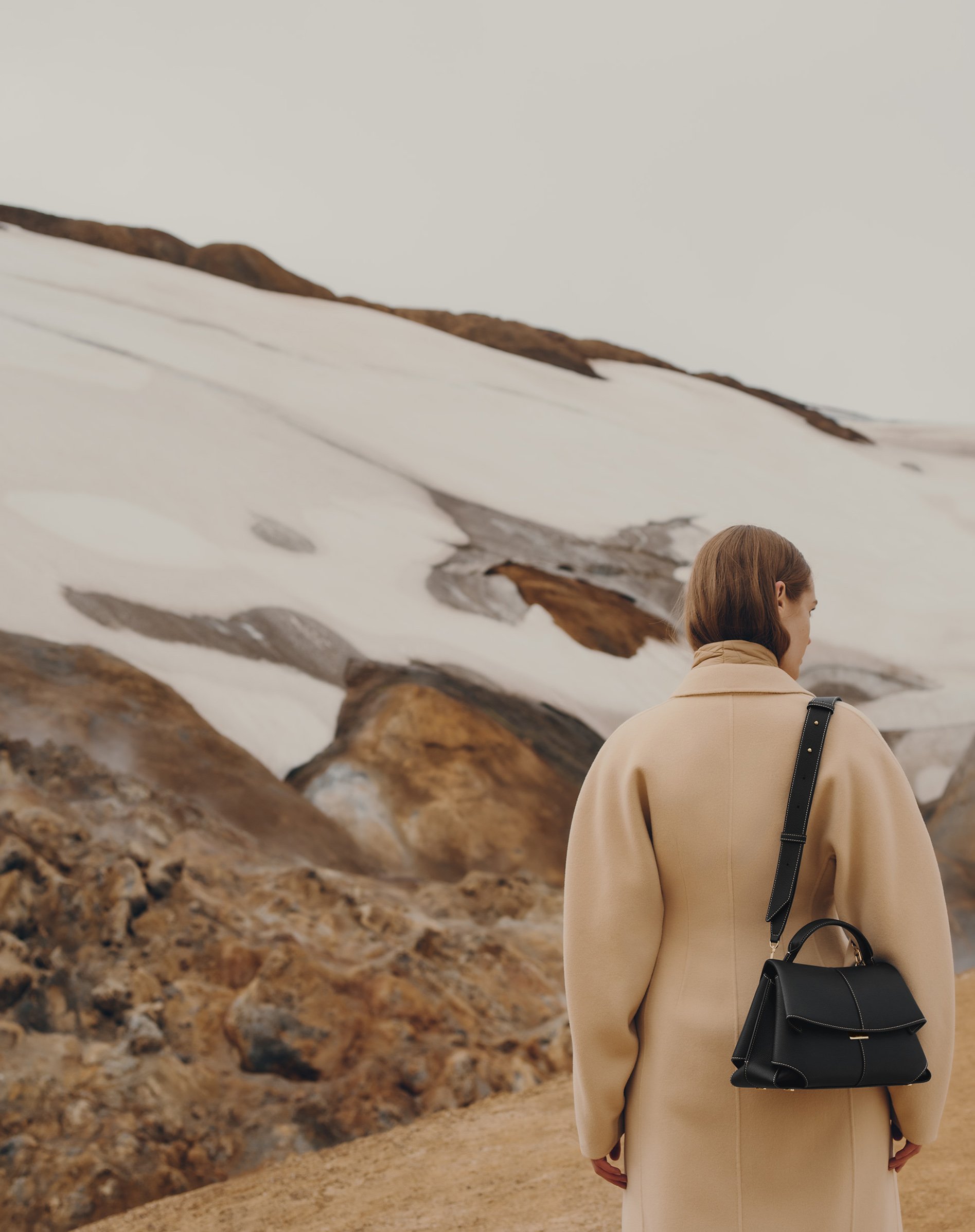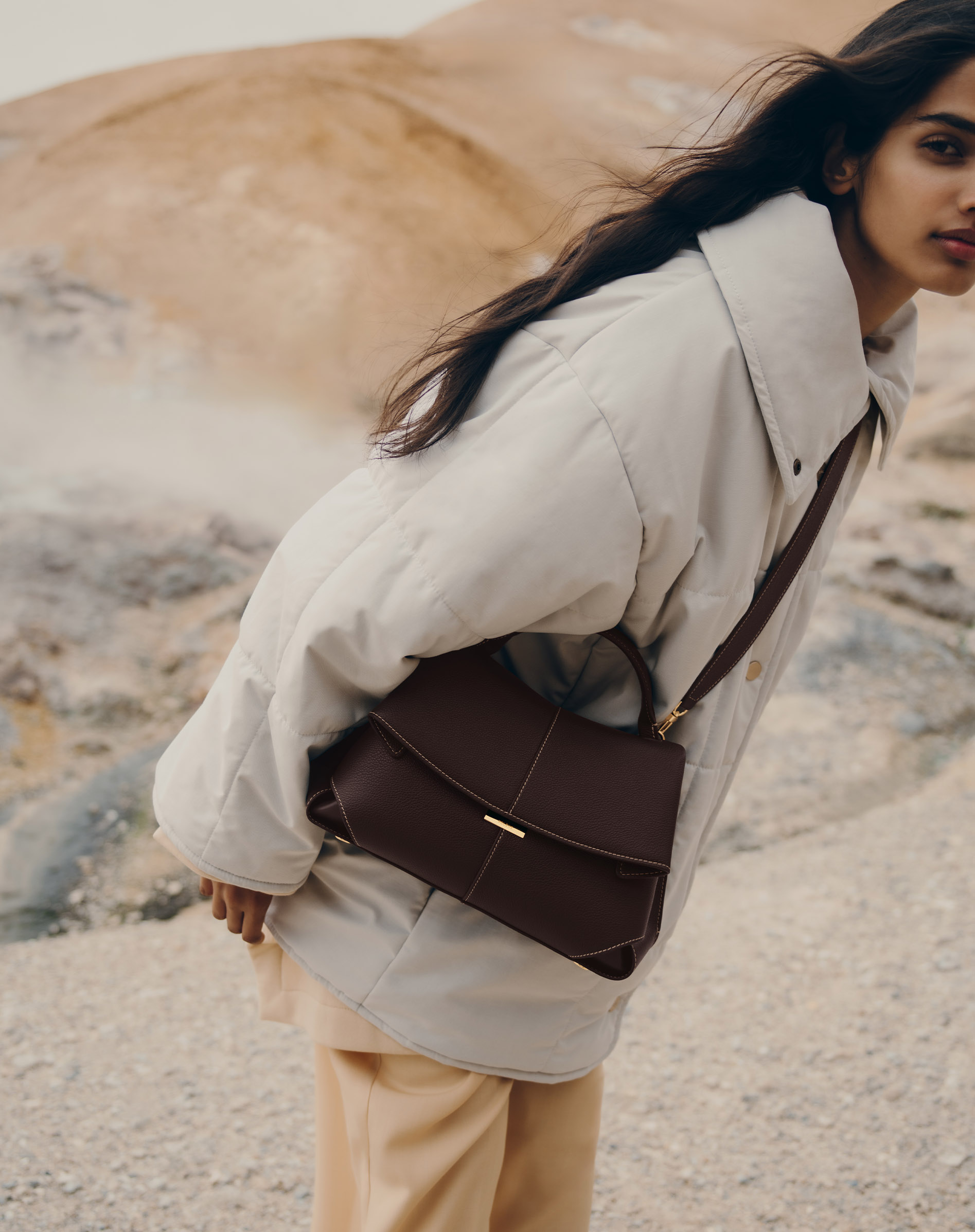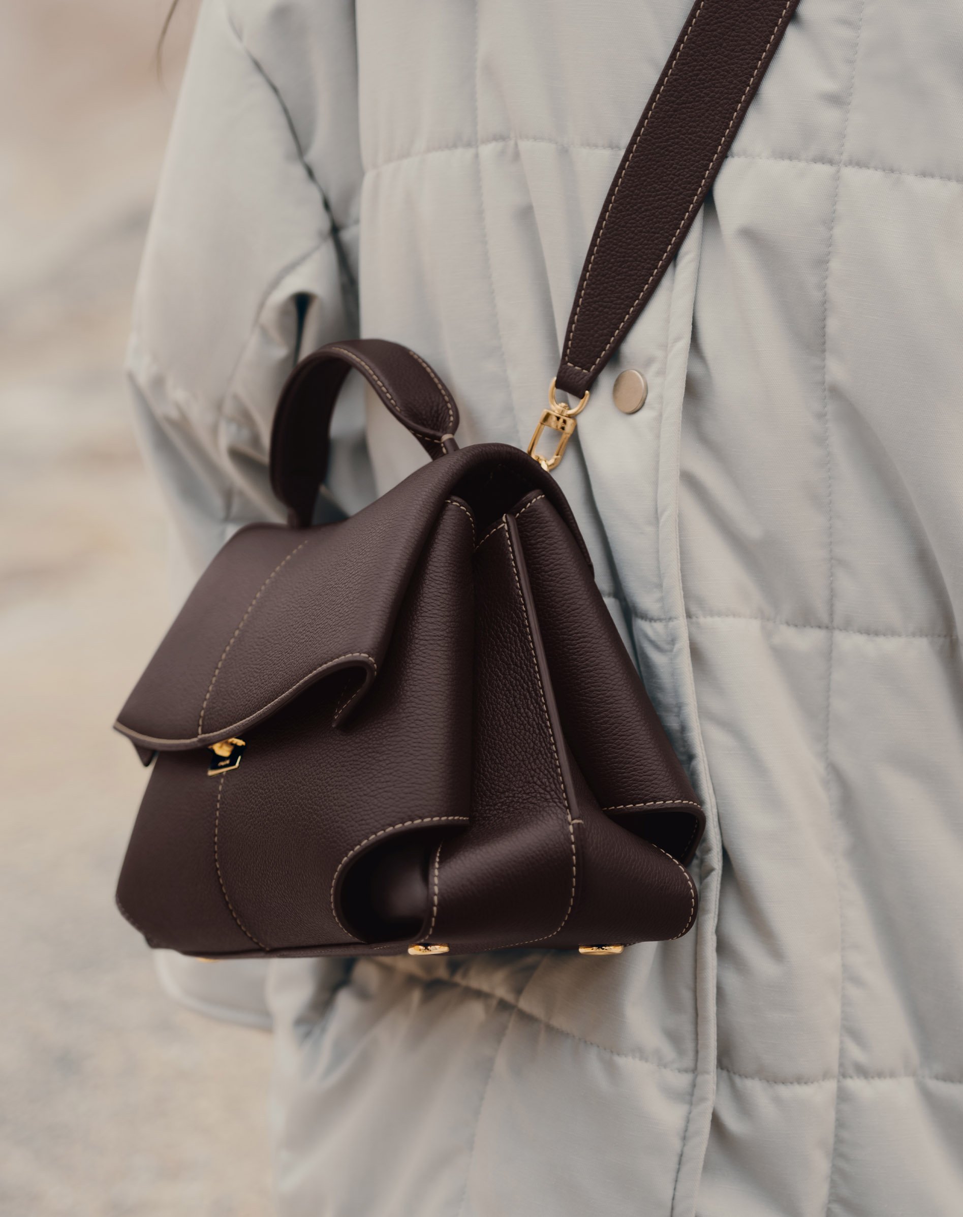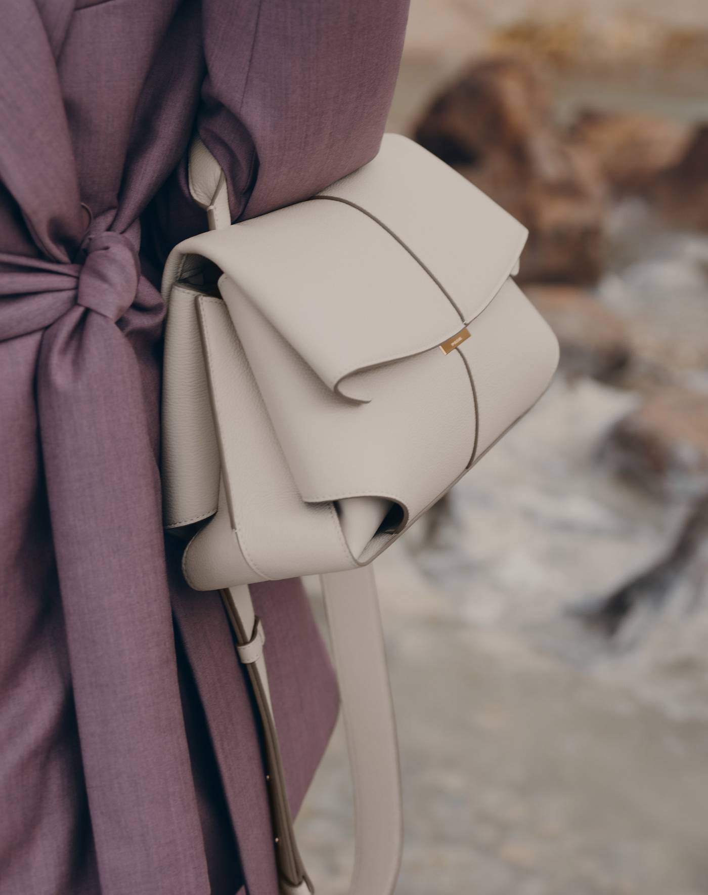 The "Mokki" model showcases the art of folding with its textured leather. The corners are cut to reveal smooth leather for a subtle interplay of textures.