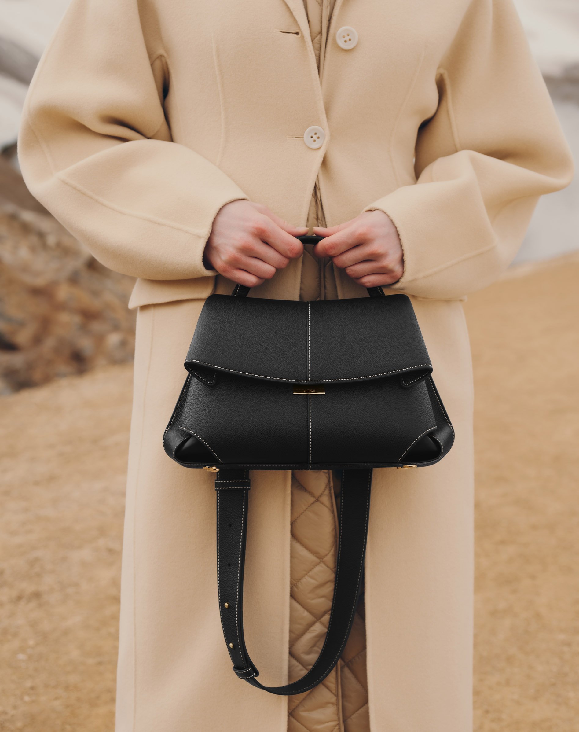 The bag’s interior is roomy and divided into compartments, all protected by a flap that features an engraved clasp. With its adjustable shoulder strap held in place by snap hooks, the model smoothly adapts to your movements.