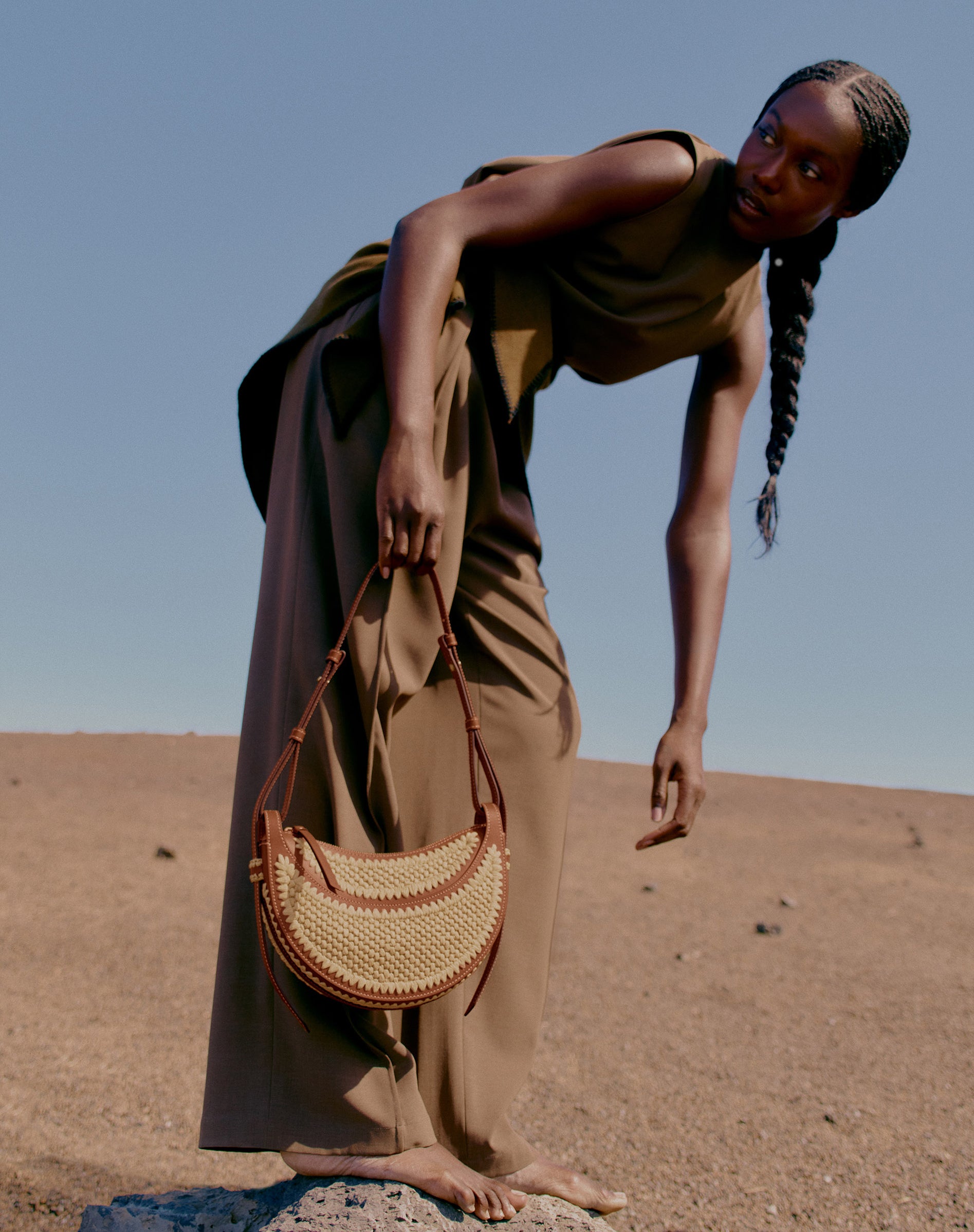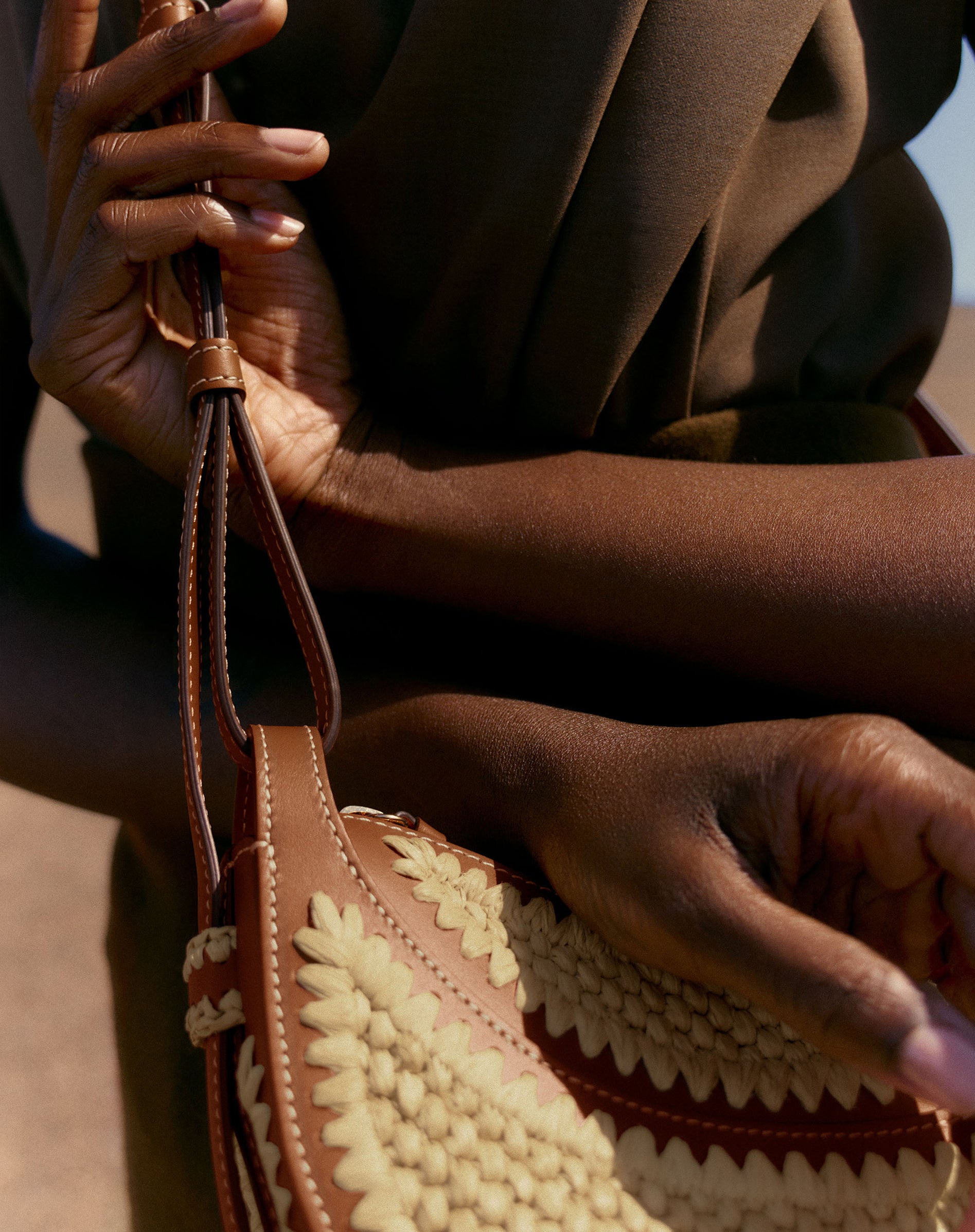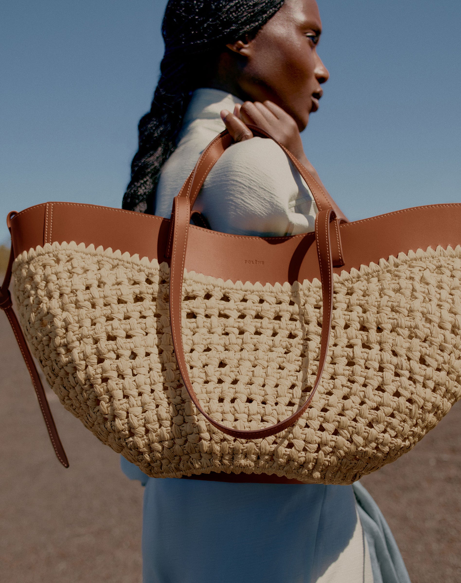 For the first time, three Polène models are adorned with this organic material, which is as supple as it is resilient. Somewhere between sculpted tote and basket, the Cyme and Cyme Mini are dressed in raffia through a unique combination of crochet stitches. For the Numéro Dix, the rice stitch technique is used for the half-moons, also crocheted in raffia. On all bags, leather and raffia are joined by hand-embroidered stitches, symbolizing the harmonious balance between these materials.