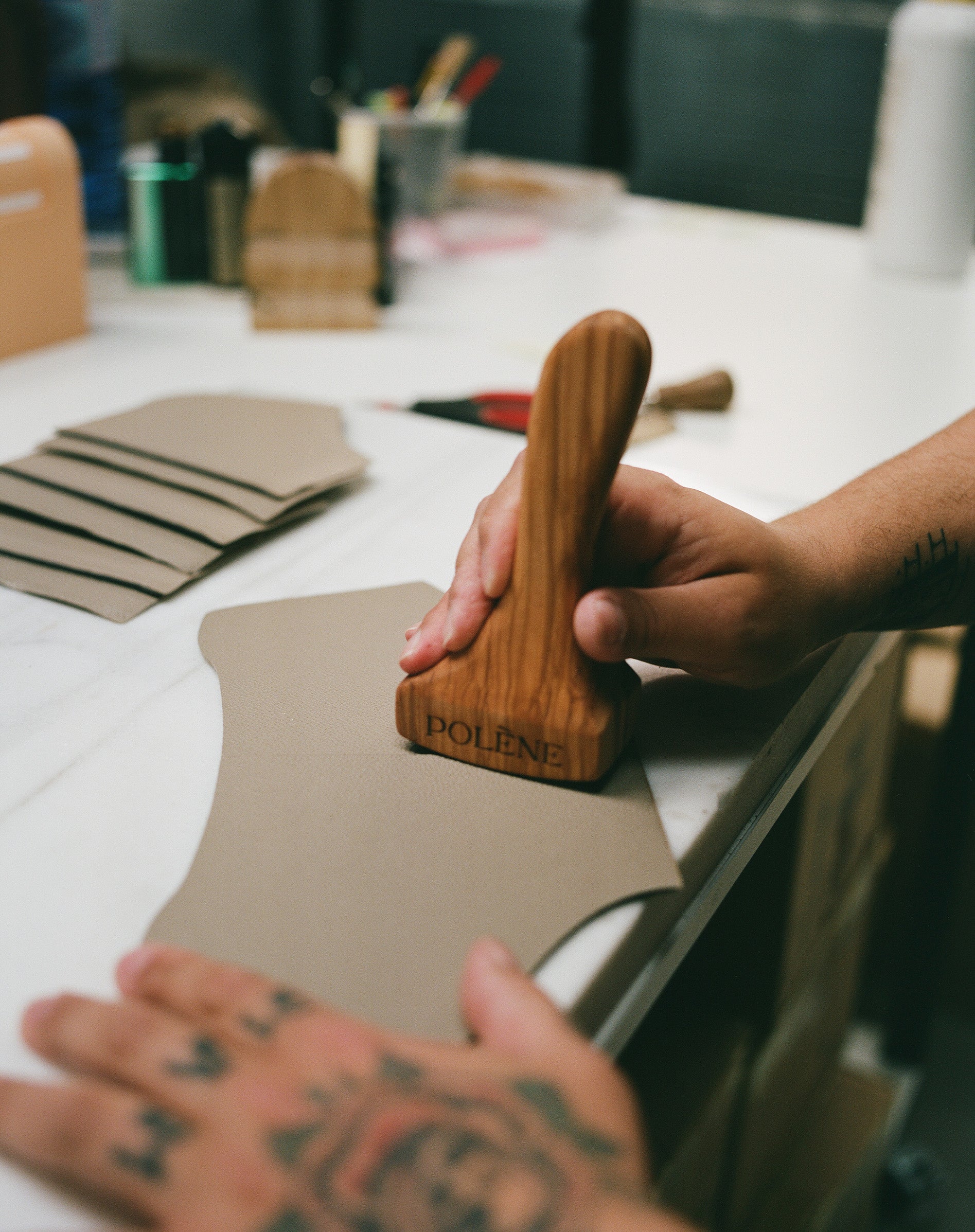 The beauty of leather is essential in expressing the creative vision and showcasing the artisans’ work. It is revealed through the hand of the leather, its touch, suppleness, structure, as well as the perfection of its surface. The leathers used by Polène are ISO 9001 certified, and their quality is rigorously inspected at multiple stages by both the tanneries and the Maison’s artisans, from pattern cutting through to the final stages of craftsmanship.