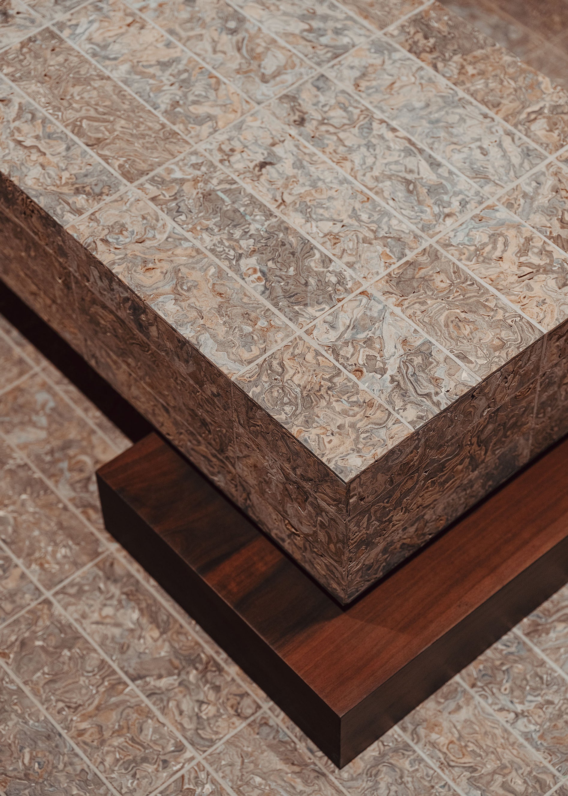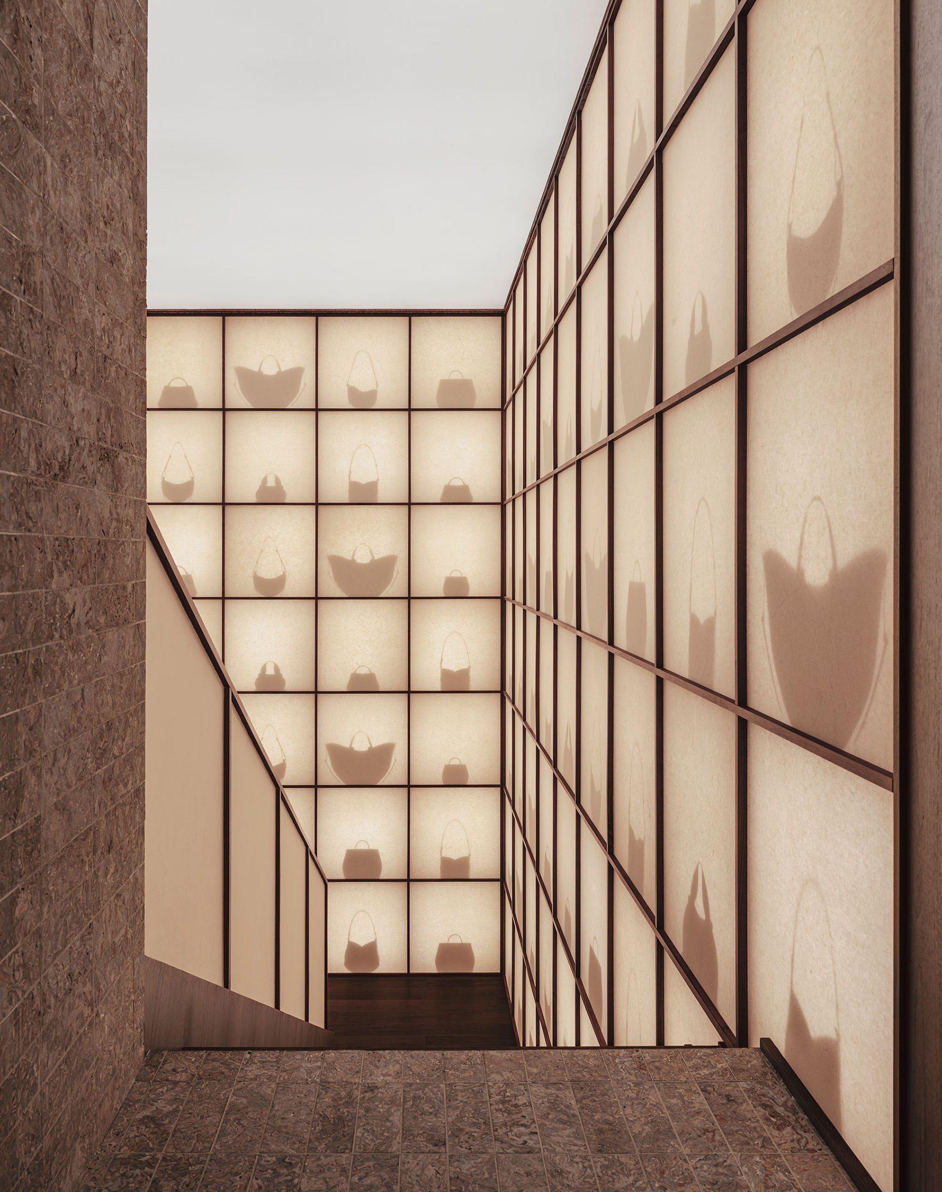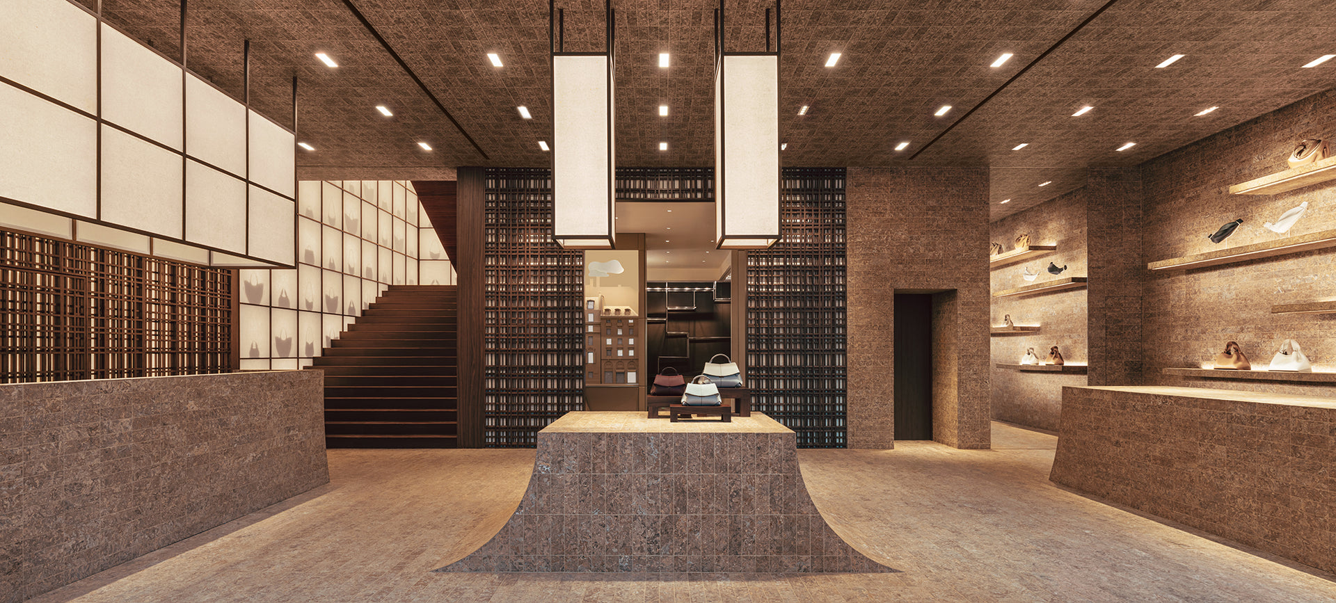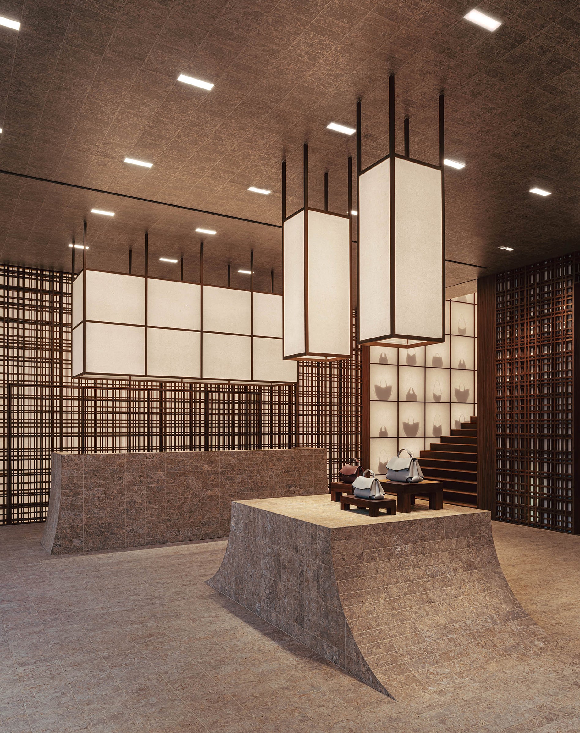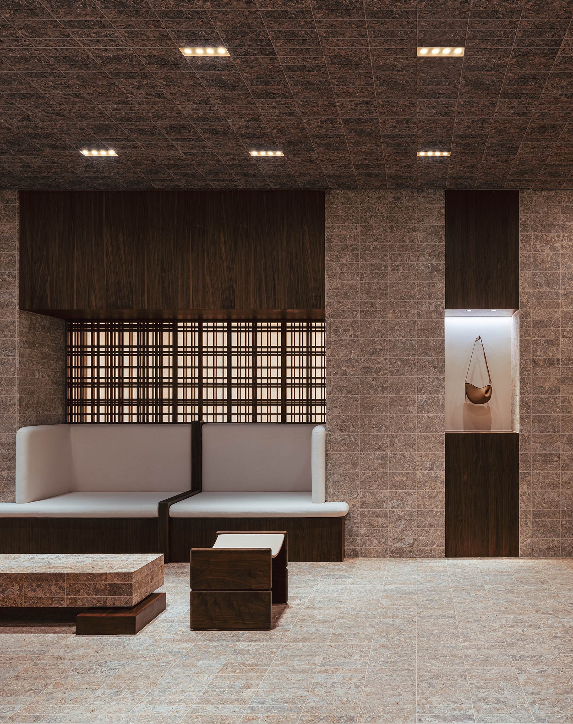 The inside of the store is characterized by a criss-cross of walnut wood complemented by leather and Xuan paper. Twelve tons of leather offcuts were upcycled to create compressed bricks, an innovative material with an almost mineral feel. The use of Xuan paper stands as a testament to Chinese cultural heritage. Produced from the Blue Sandalwood tree and rice straw, this traditional paper is subject to a precise artisanal process, passed down orally over generations.