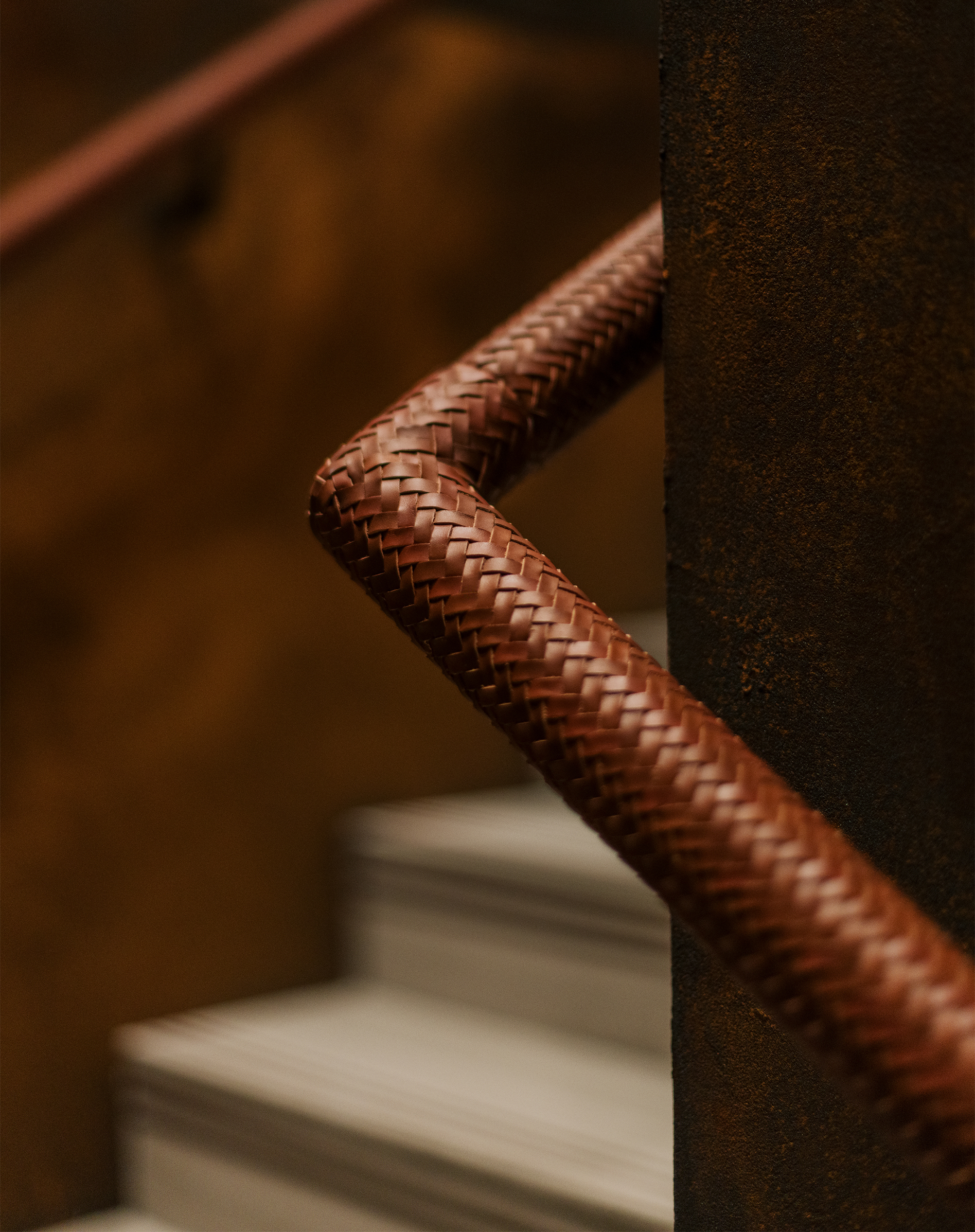 The staircase’s leather-braided banister guides visitors upstairs. This piece is the work of artisans at Alma Studio, a historic British workshop that specializes in leather furniture. Hand-tied tubular braiding joins 32 thin straps.