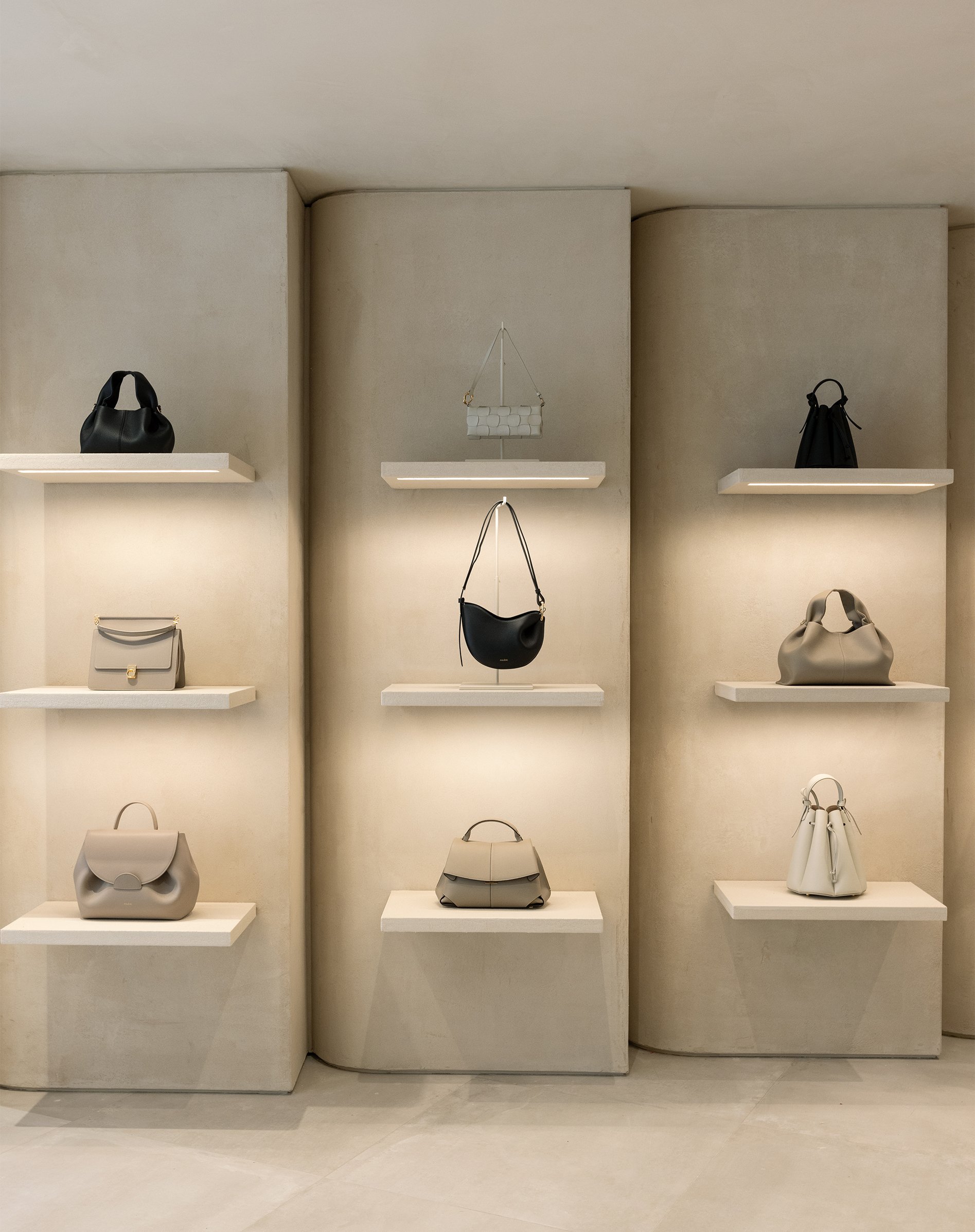 Designed by WGNB, the London store celebrates the intersection of the district’s characteristic brutalist architecture and Polène’s elegant minimalism. Corten steel and concrete contrast with the brand’s collections organic shapes. Polène’s mastery of leather is showcased through a variety of creative techniques. On the ground level is an entire wall of bricks crafted from compressed leather off-cuts. This innovative process, developed in Ubrique’s leather goods workshops, has also been used to create a sculptural table.