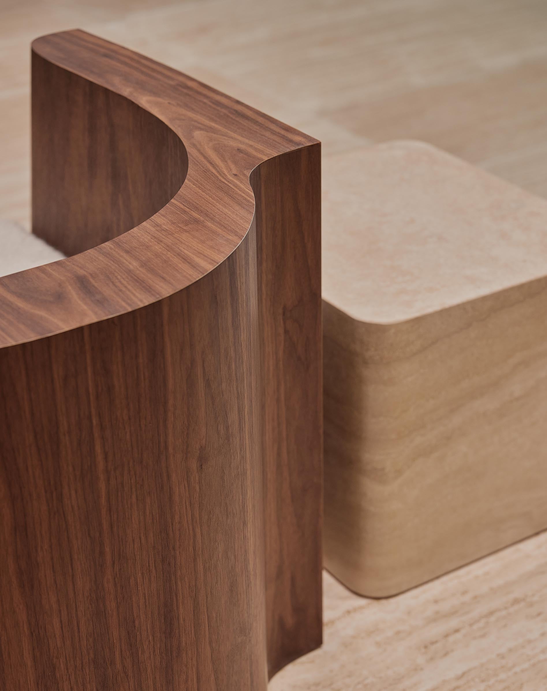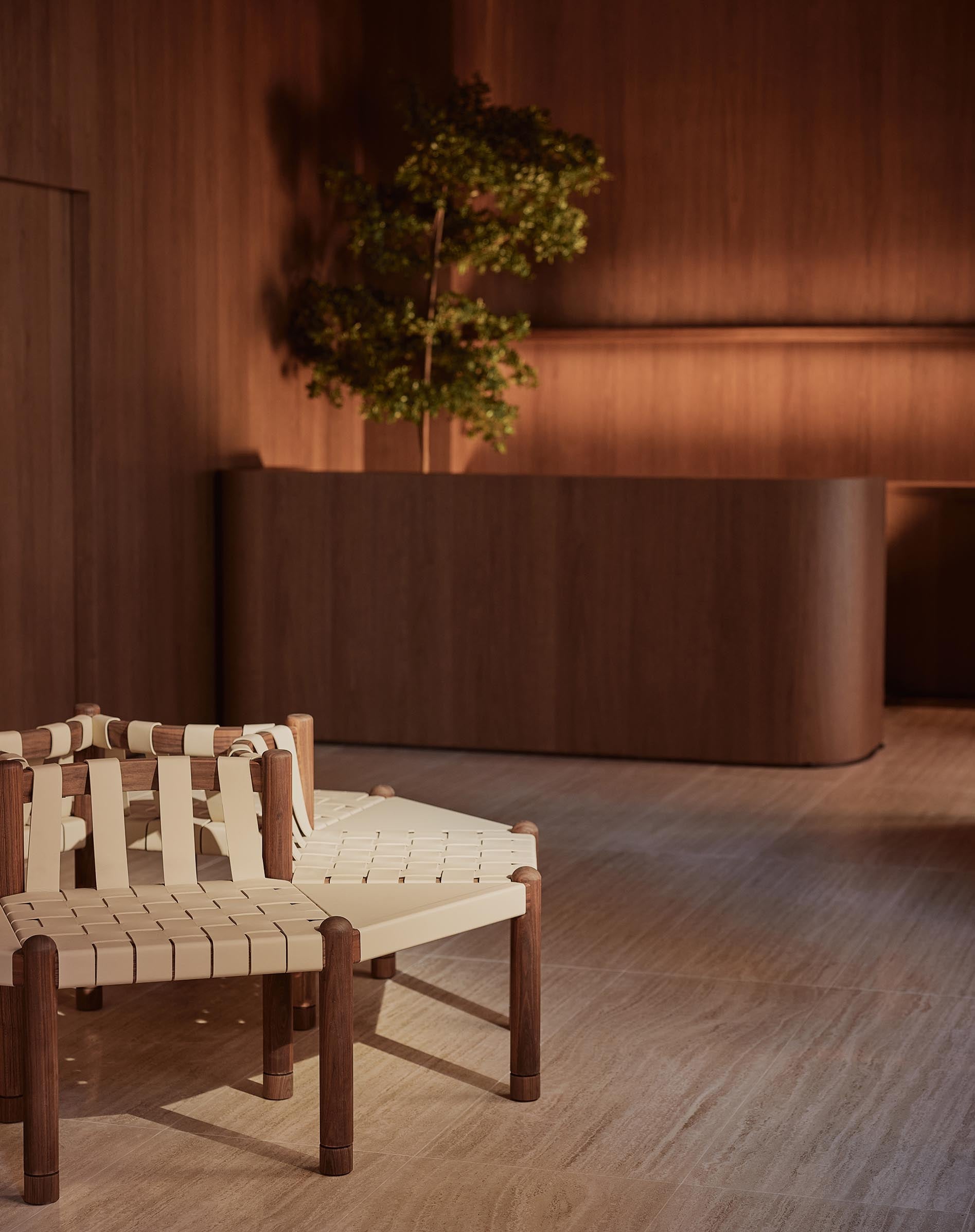 In the middle sits a table made of compressed leather scraps by designer Jorge Penadés, reflecting Polène’s profound respect for craftsmanship and leather work.