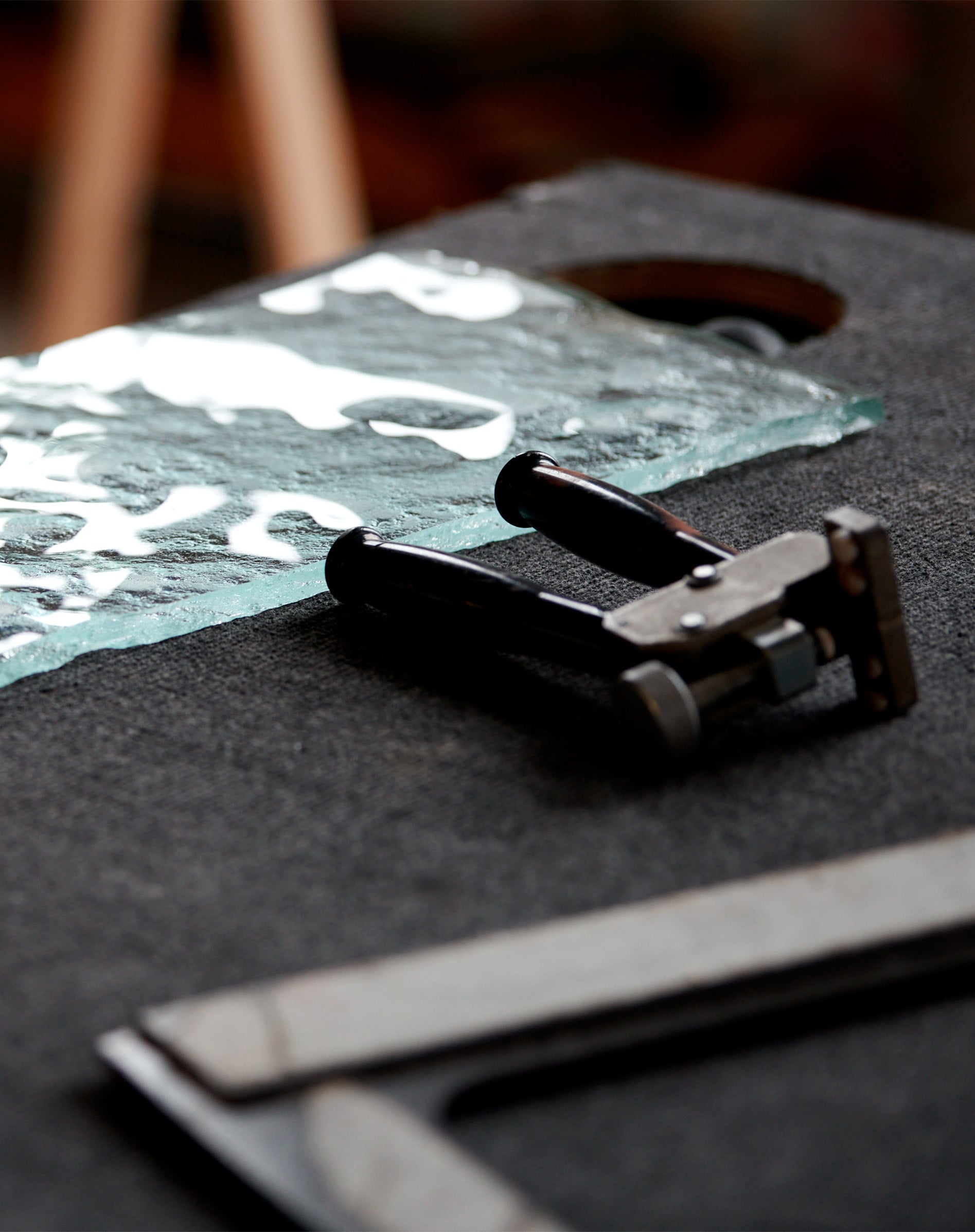 With its glass panels designed by Atelier Barrois glassmakers, the staircase echoes flowing water. These same artisans also collaborated with designer Johan Viladrich to create a custom glass table that resembles ice.