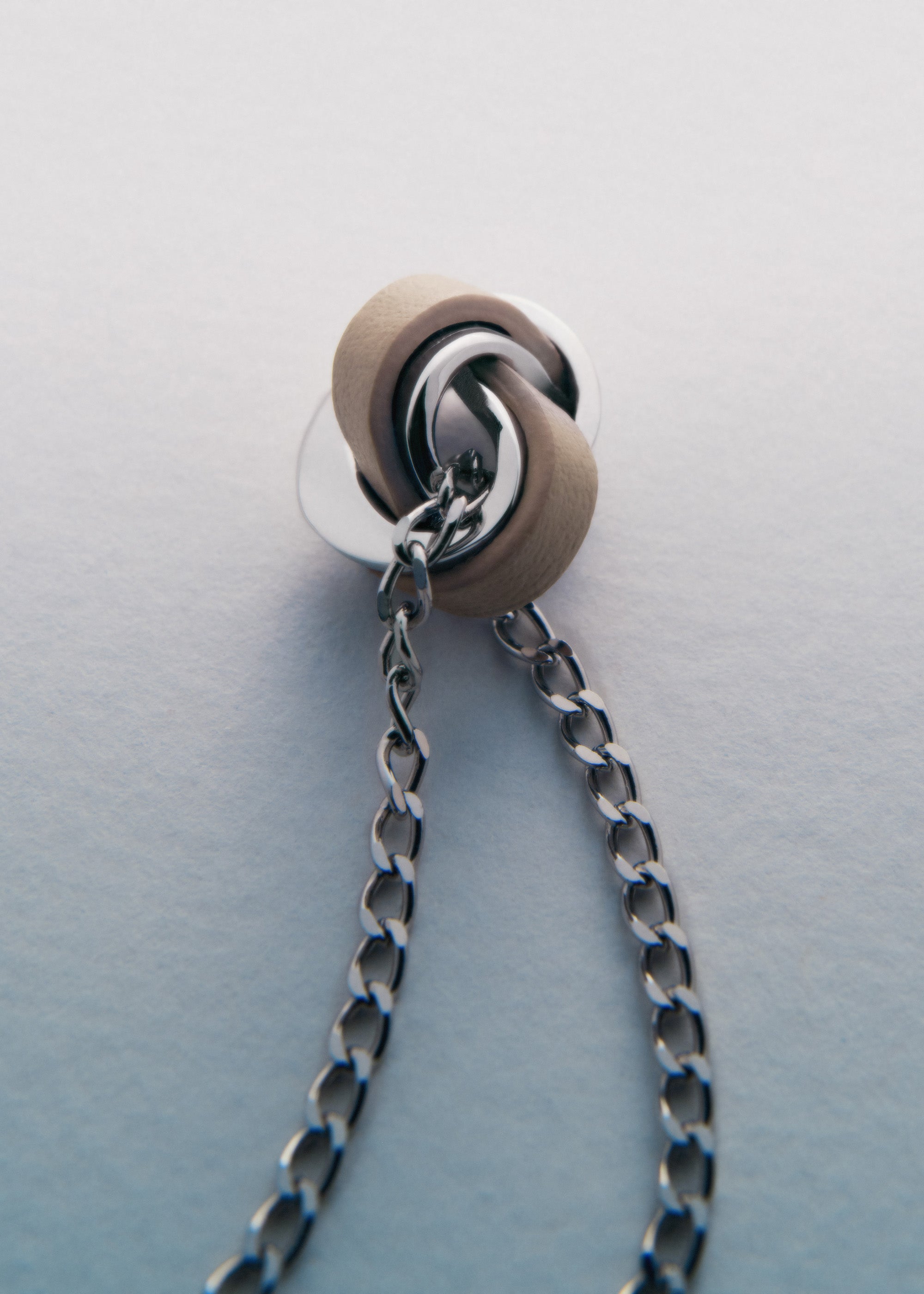 The Ormé necklace has a knotted pendant intertwined with leather and metal. This symbol of harmony between different forms of savoir-faire can slide freely along the chain.