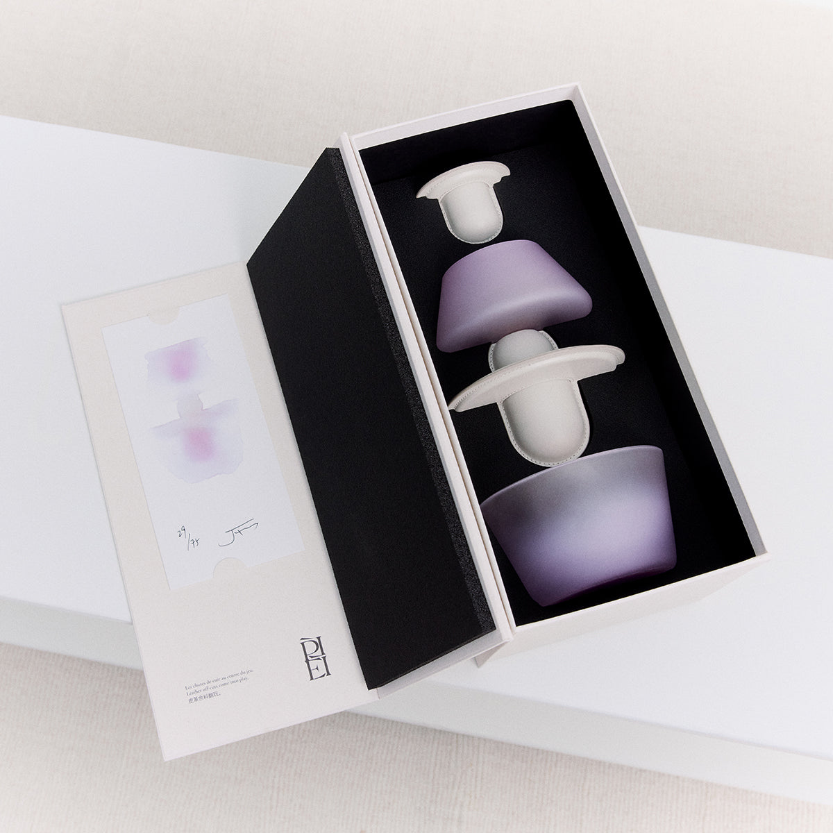 Created in collaboration with Chinese artist Jinya Zhao, the Uzlo totem-style sculpture is constructed of layers that create an interplay between the radiance of glass and the opacity of leather. Blown into custom molds, the glass pieces are mixed with pigment and then meticulously hand-polished with diamond tools to achieve a frosted appearance. Polène’s leather-working artisans cover the wooden pieces with leather before stitching the seams and painting the edges. The name “Uzlo”, a twist on the word “puzzle”, echoes the totem-like esthetic of the piece designed as an assembly of interlocking geometric shapes. Limited series: 150 pieces. Each piece is supplied with a numbered reproduction of one of the artist’s watercolors.