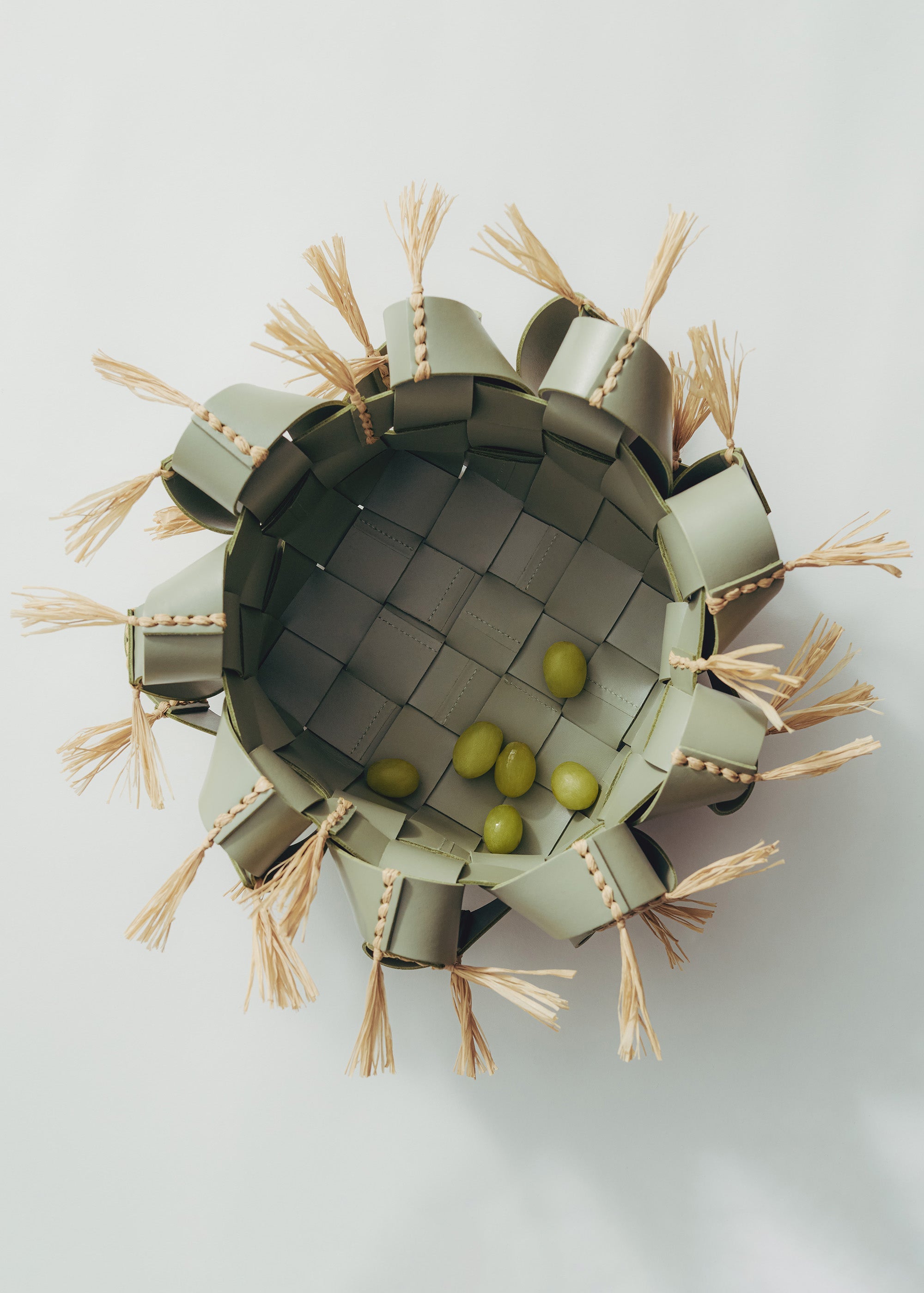 Resulting from a collaboration between Polène and Danish designer Sia Hurtigkarl, the Yni basket celebrates the art of braiding. Through a play of infinite loops, the leather offcuts become central to the creative process, interlaced with hand stitching in natural raffia. Seemingly without beginning or end, the design for the Yni basket embodies the idea of circularity fundamental to the Plèi collection.