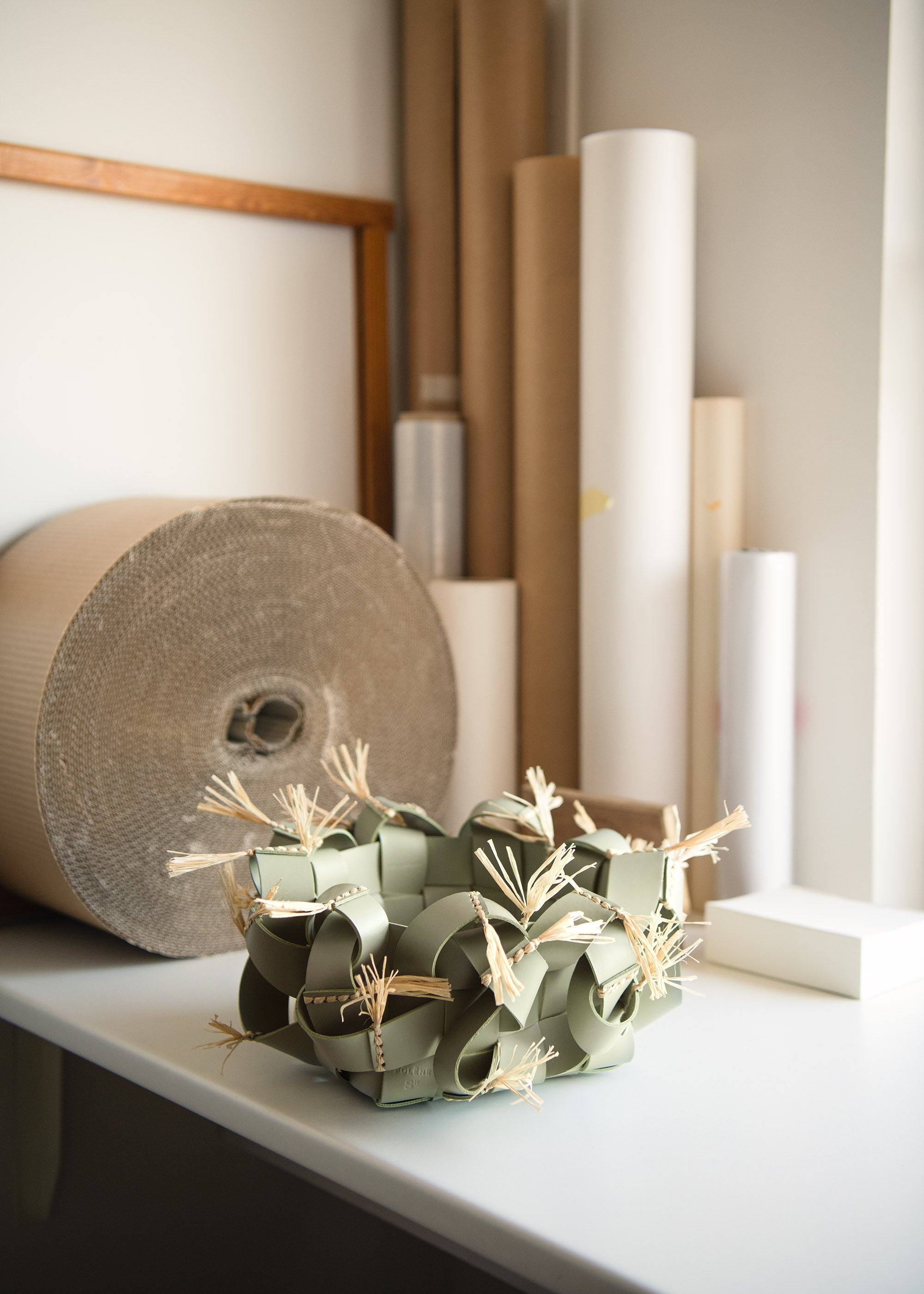Each piece in this limited edition is handcrafted and may vary somewhat in size and colour. As the leather comes from offcuts, it may wrinkle slightly at folds. The raffia stitching maintains the shape and structure of the basket. It may become a bit compressed during transport and can be gently repositioned by hand, taking care not to pull on the ends. -